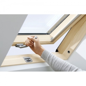 Нижняя ручка открывания мансардного окна GZL 1051 B, установленного на высоте 130-160 см от уровня пола. Такая модель мансардного окна актуальна для мансарды, когда не удалось избежать высокого пристенка.